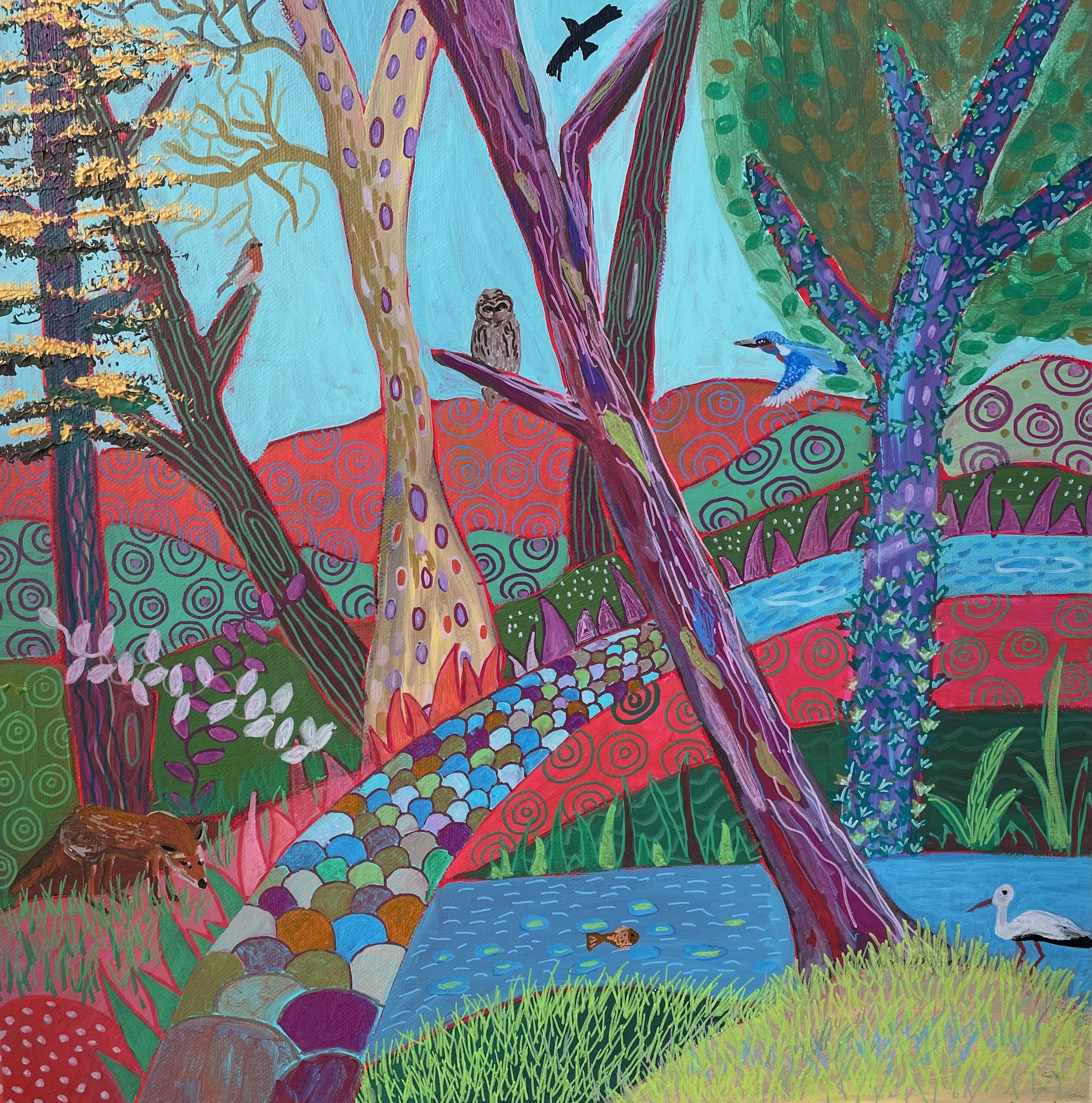 This painting is inspired by Double Waters at Westmoor in Devon. It is one of my favourite places to be and where I can see wildlife, listen to the stream and the song of birds. It is a place I can be present, calm and connected to the natural world and to my inner bliss.